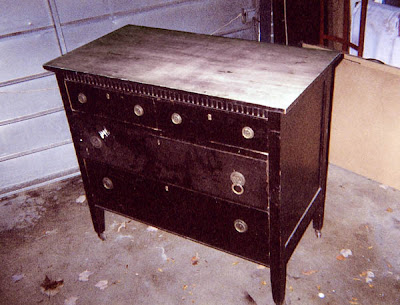 I started with a vintage dresser that I had purchased at a thrift store for $18. It had a dark cherry stain and the veneer on the top of the dresser was missing completely.